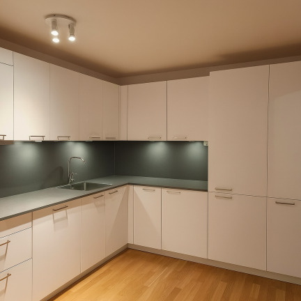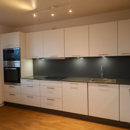 - Köket är ljust och rymligt med vita luckor och mörkgrå bänkskiva och stänksskydd. Utrutsningen består av 1 st delad kyl- och frys, induktionshäll, mikro och diskmaskin.