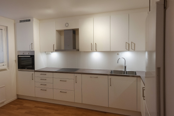 - Köket är ljust och rymligt med vita luckor och mörkbrun bänksskiva, fullt utrustat med dubbel kyl- och frys, induktionshäll och intergerad diskmaskin.