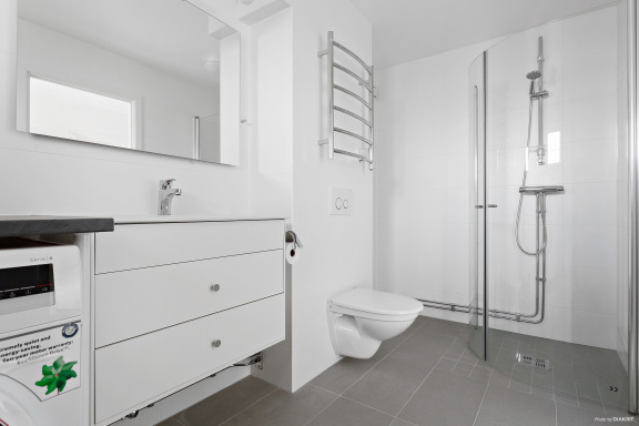 • Helkaklat badrum med ljusa ytskikt, vägghängd toalett, kommod, duschväggar i glas samt tvättmaskin- och torktumlare under praktisk arbetsbänk.