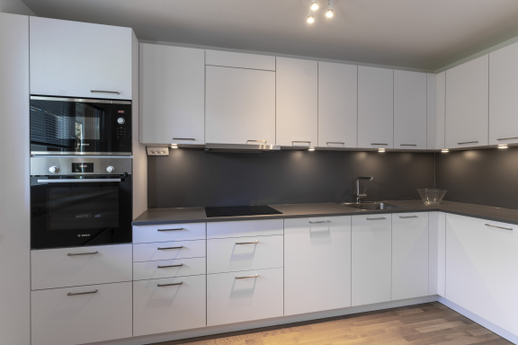 • Köket är ljust och rymligt med vita luckor och mörkgrå bänksskiva, fullt utrustat med 1 st delad kyl- och frys, induktionshäll, mikro och intergerad diskmaskin.