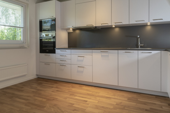 • Genomgående parkettgolv och ljusa väggar.