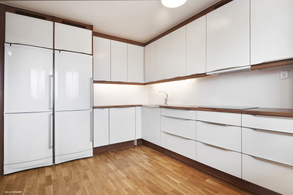 - Köket har vita luckor och en stomme i valnöt. Utrustningen består av dubbel kyl- och frys, induktionshäll och diskmaskin.