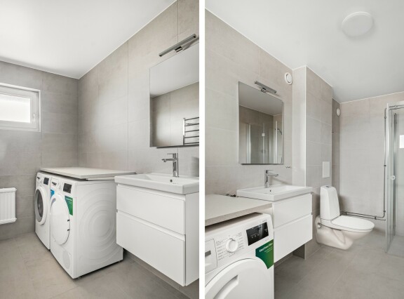 - Helkaklat badrum med ljusa ytskikt, vägghängd toalett, kommod, duschväggar samt tvärrmaskin och torktumlare under praktisk arbetsbänk.