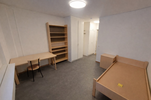 Rummet är möblerat med sängram, skrivbord, stol, hurts och bokhylla – redo för inflytt. Fiberanslutning finns i fastigheten, och du tecknar själv internetabonnemang.