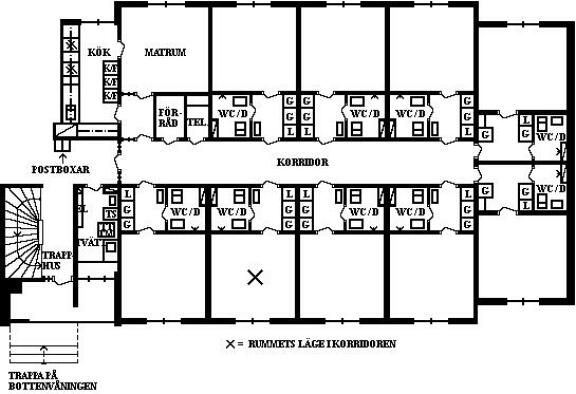 Här bor du på cirka 20 kvm en halv trappa upp. Rummet har egen dusch och toalett, medan kök och vardagsrum delas med åtta andra studenter. Möblering ingår och består av sängram, skrivbord, stol, bokhylla och hurts. I köket finns delad kyl samt eget torrvaruskåp, och husgeråd erbjuds med variation mellan korridorerna.