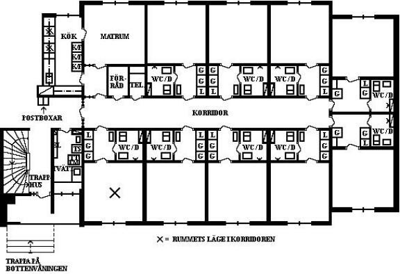 Du bor i ett möblerat enkelrum om 20 kvm, beläget en trappa upp i fastigheten (ej hiss). Rummet har egen dusch och toalett, vilket ger extra bekvämlighet i vardagen. Boendet är utformat som en korridor där du delar kök och vardagsrum med åtta andra studenter – en social boendeform med goda möjligheter att lära känna nya människor.