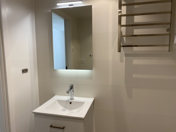 I hallen finns tre rymliga garderober, och det ljusa, helkaklade badrummet är utrustat med dusch, golvvärme och handdukstork. Till lägenheten hör även förråd i källaren.