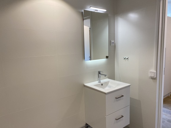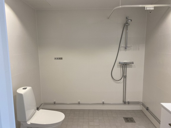 • Ljust, helkaklat badrum med dusch, golvvärme och handdukstork
