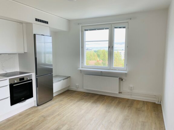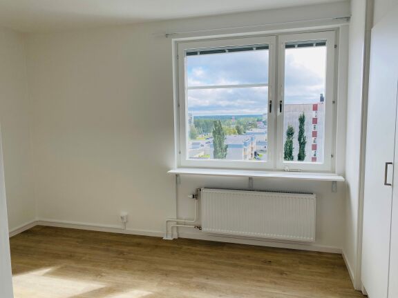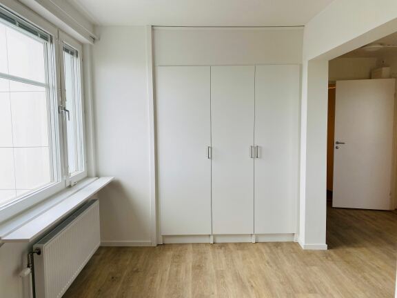 Bostaden har vita väggar och vackert trägolv som skapar en ljus och modern känsla. Det fullt utrustade köket är försett med induktionshäll, varmluftsugn, mikro samt goda förvaringsmöjligheter. I rummet finns tre rymliga garderober som ger praktisk förvaring.