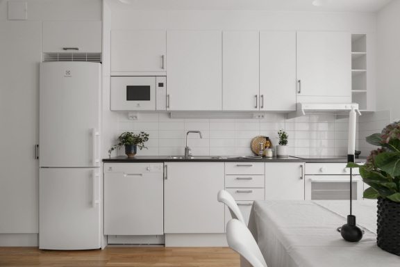 Lägenheten erbjuder en genomtänkt planlösning och moderna materialval som skapar ett trivsamt och funktionellt boende. Köket är stilrent och välutrustat med diskmaskin, induktionshäll och inbyggd mikrovågsugn. Här finns gott om förvaring och praktiska arbetsytor som gör både vardag och matlagning smidigare.
