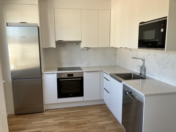 Köket har vita köksluckor, bänkskivor i kompositsten och moderna vitvaror – induktionshäll, varmluftsugn, kyl/frys, diskmaskin och mikrovågsugn. Säkerhetsdörr ger trygghet och ljuddämpning.
