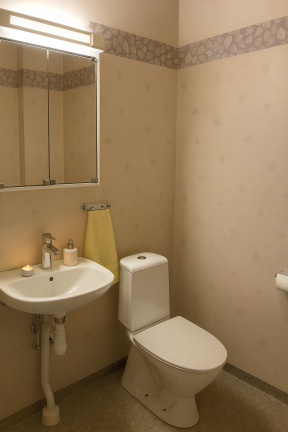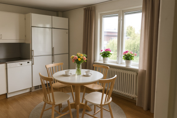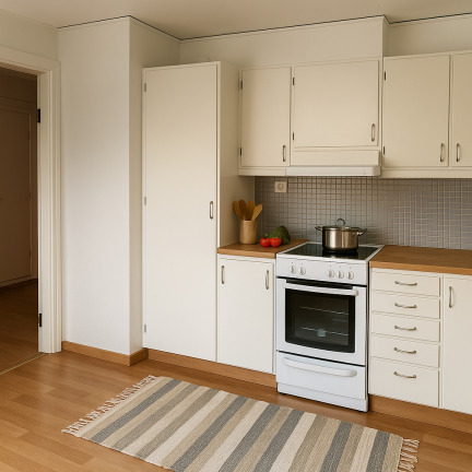 Bostaden präglas av klassiska materialval, generöst ljusinsläpp och en planlösning som passar både singelhushåll, par och mindre familjer.