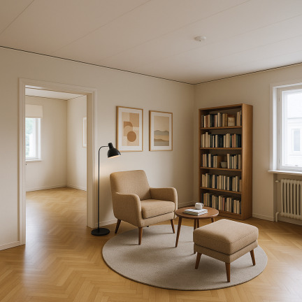 Denna trivsamma lägenhet på 85 kvm erbjuder ett ljust och luftigt vardagsrum med vacker fiskbensparkett som fortsätter in i angränsande rum, avskilt med eleganta skjutdörrar. Rummet kan med fördel användas som matsal, kontor eller extra sovrum – flexibel planlösning som passar din livsstil.