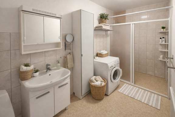 Köket är funktionellt och utrustat med diskmaskin samt spis med häll, vilket gör matlagningen både smidig och trivsam. Badrummet är modernt utrustat med tvättmaskin för extra bekvämlighet i vardagen.