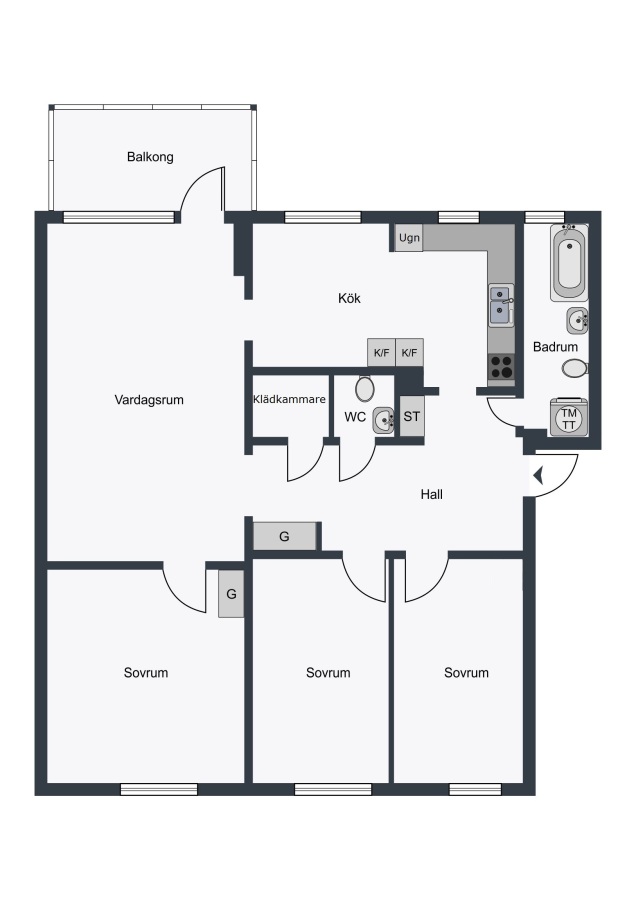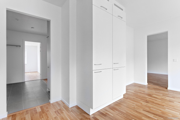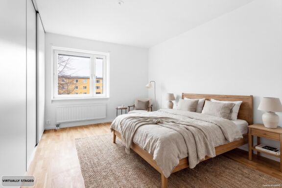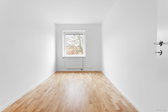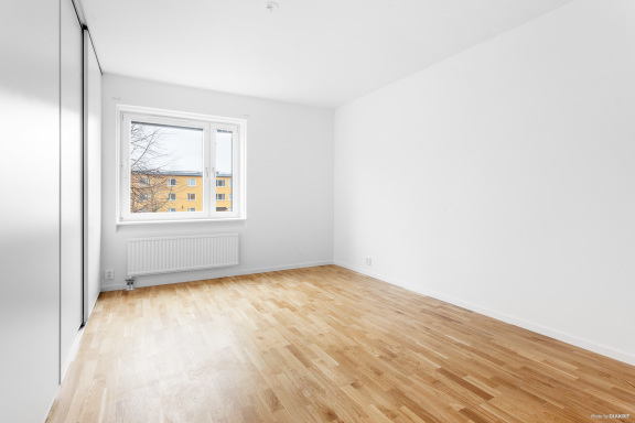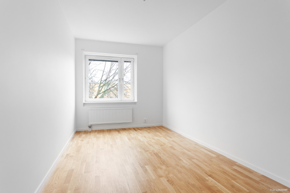 Bostaden rymmer tre sovrum, varav ett större med praktisk skjutdörrsgarderob. Samtliga rum har ljusa ytskikt med målade väggar och genomgående ekparkett, vilket skapar en enhetlig och varm känsla.