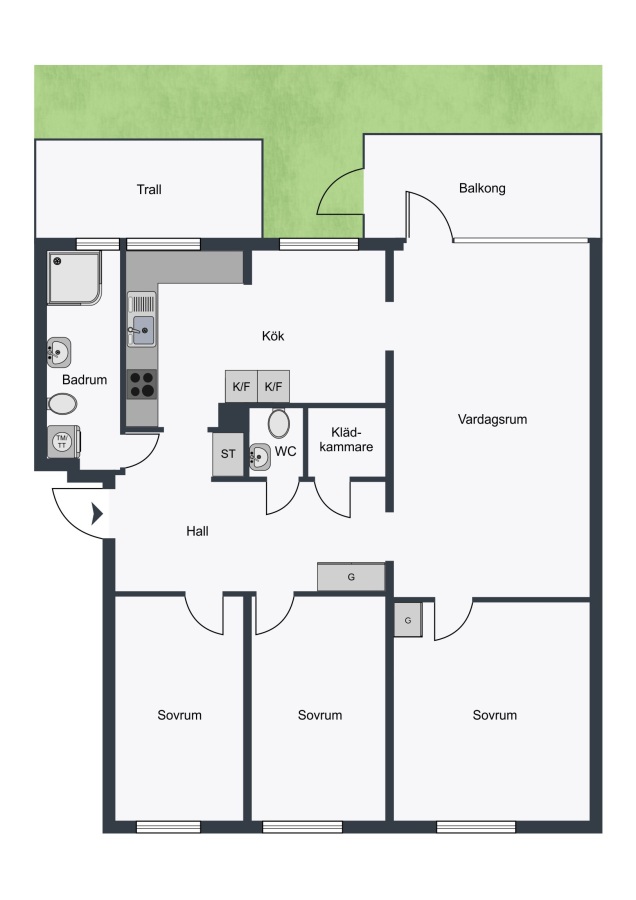 Lägenheten har en välplanerad disposition med tre sovrum, ett stort och ljust vardagsrum samt ett praktiskt kök med goda arbetsytor. Samtliga rum, förutom badrum och separat WC, kommer att vara nyrenoverade vid inflyttning vilket skapar en modern och fräsch helhetskänsla.