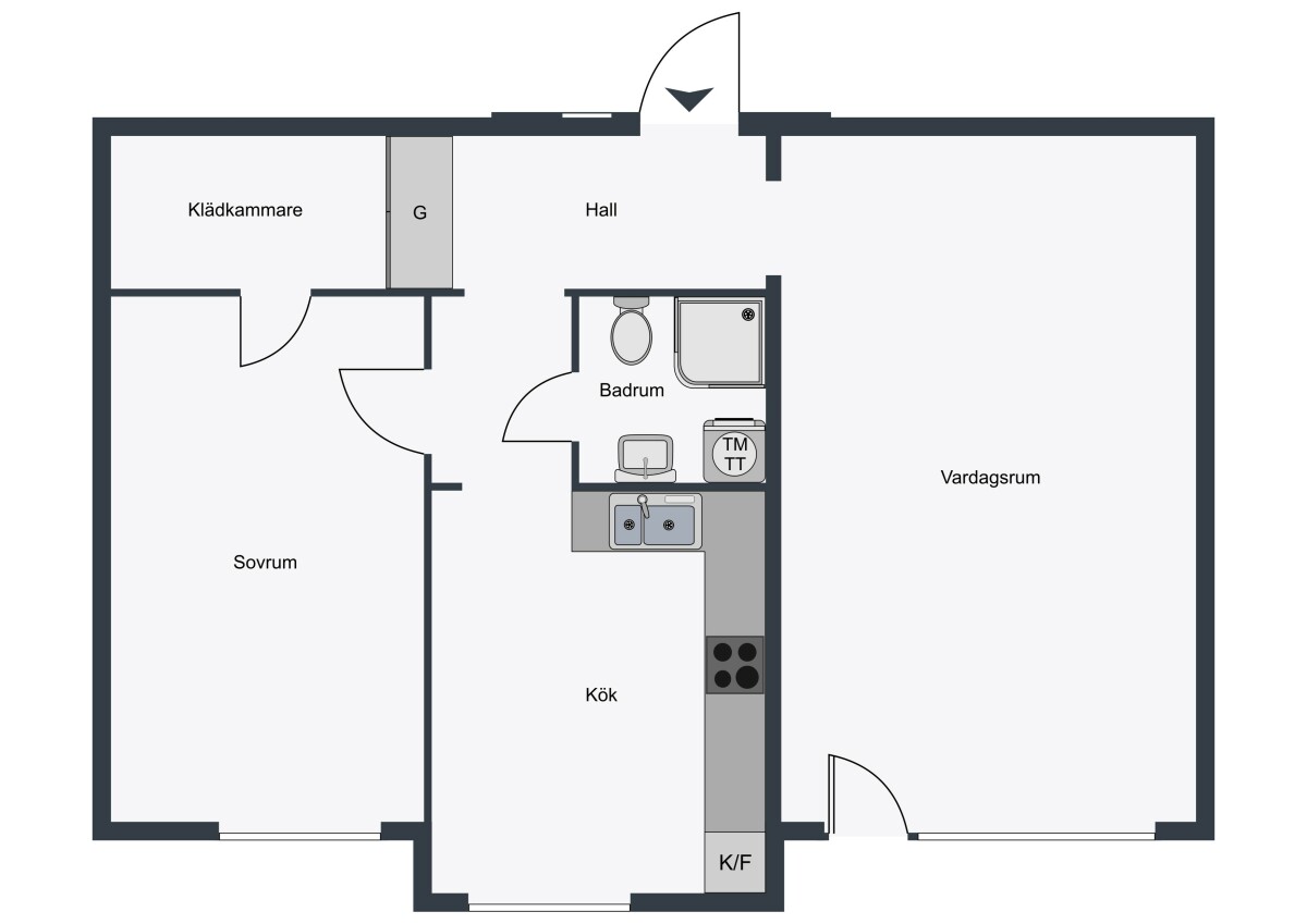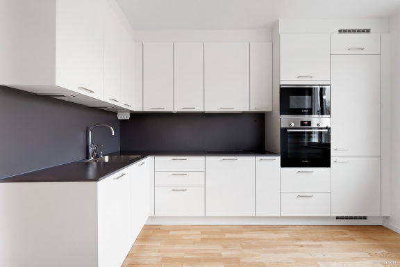 - Kök: Ljust och modernt kök med vita skåpluckor, grå bänkskiva och stilren design. Fullt utrustat med diskmaskin, inbyggd ugn, mikrovågsugn, häll samt kyl och frys i rostfritt utförande. Plats för matgrupp vid fönstret.