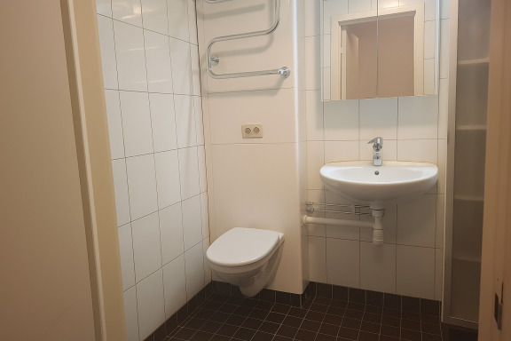 • Helkaklat badrum med dusch, handdukstork och spegelskåp