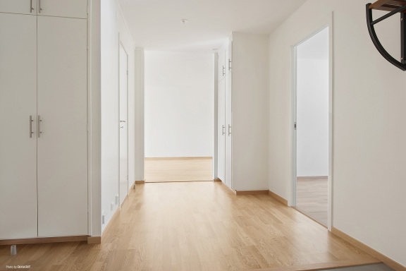 Badrummet är helkaklat och utrustat med både tvättmaskin och torktumlare, vilket underlättar vardagen. Utöver detta finns praktiska förvaringslösningar i form av en klädkammare i hallen och förråd med ingång från trapphuset.