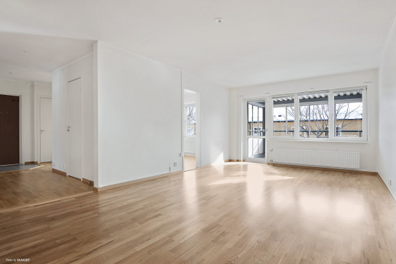 Lägenheten har ett ljust och luftigt vardagsrum med plats för både soffgrupp och matbord. Köket är modernt och funktionellt med goda arbetsytor och förvaring, samt plats för matlagning i vardagen. Två separata sovrum ger flexibla möjligheter för familj, hemmakontor eller gästrum.