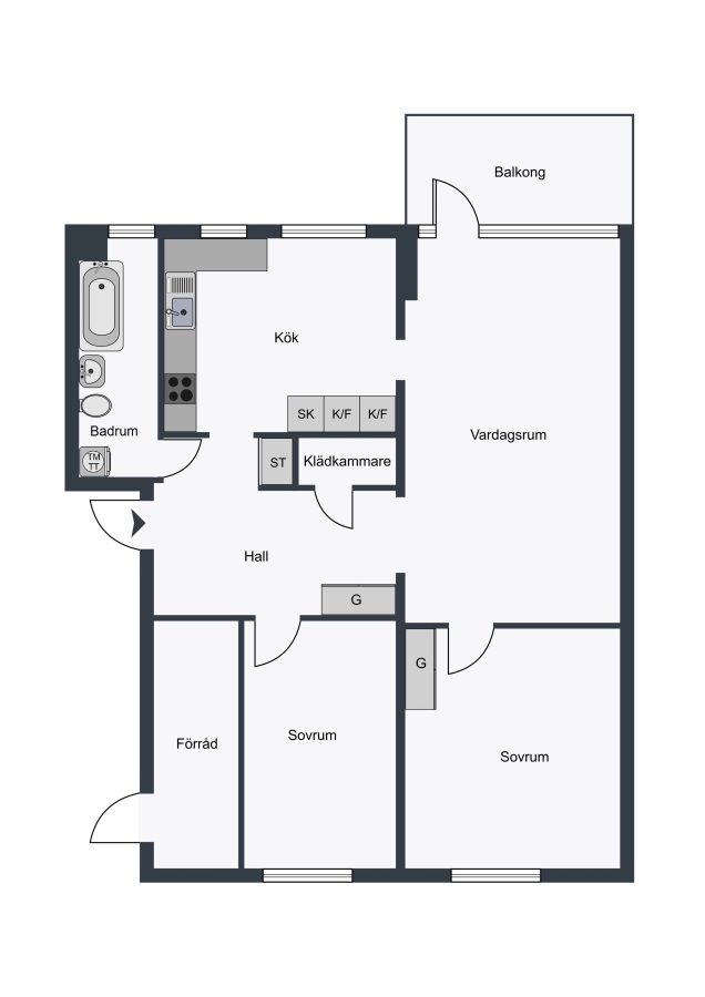Det moderna köket erbjuder gott om arbetsyta, snygga vita luckor och maskinell utrustning. Här finns bra plats för matbord för minst fyra platser. Intill ligger vardagsrummet – luftigt, lättmöblerat och med utgång till balkongen som förlänger bostaden sommartid.