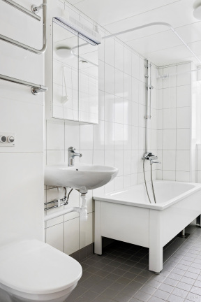 - Tvättmaskin och torktumlare i badrum med badkar och handdukstork