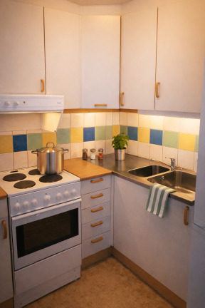 Bostaden är smart planerad med en avskild sovalkov som skapar en naturlig uppdelning mellan vila och vardagsrum. Det rymliga pentryt är utrustat med spis, kyl och frys samt gott om förvaring, vilket gör det enkelt att laga mat och hålla ordning.