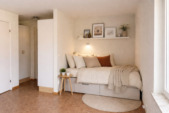 Ljus och välplanerad studentetta på campus – sovalkov, förråd och hyresfri sommar