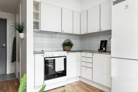 Kök: Ljust och öppet kök med vita luckor, kakel, spis med glashäll samt kyl/frys. De vita väggarna och parkettgolvet skapar en luftig atmosfär, och den franska balkongen ger extra ljus och charm.