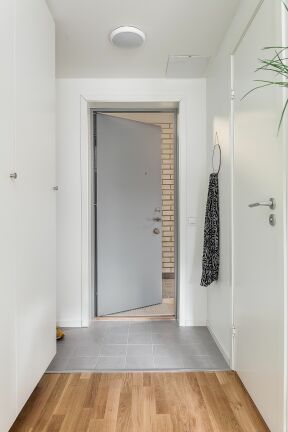 Hall: Praktisk hall med klinkergolv, parkett, säkerhetsdörr och hela fyra rymliga garderober som ger gott om förvaring.