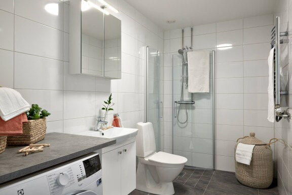 - Helkaklat badrum med duschväggar, handdukstork och kombinerad tvättmaskin/torktumlare