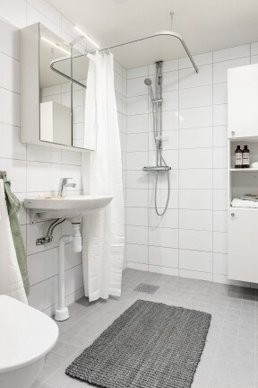 - Badrum: Helkaklat badrum utrustat med dusch, badrumsskåp och handdukstork.