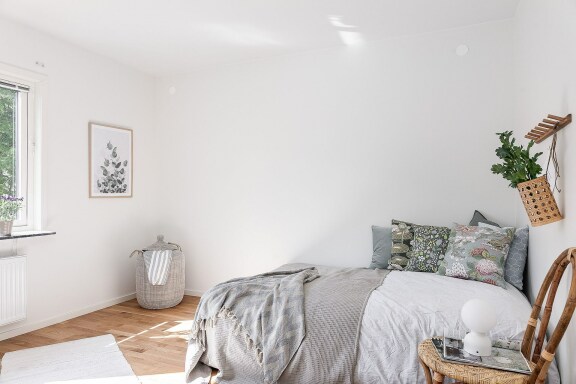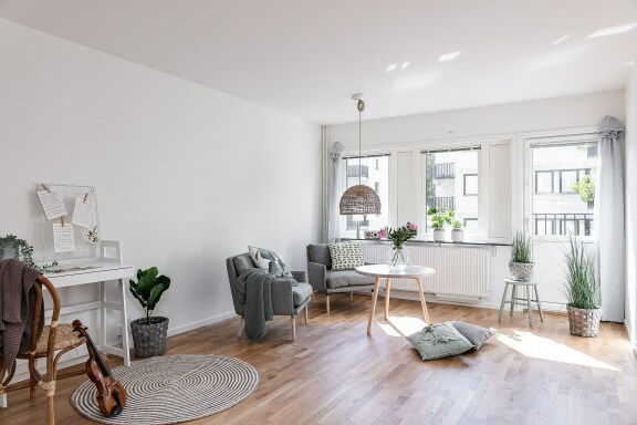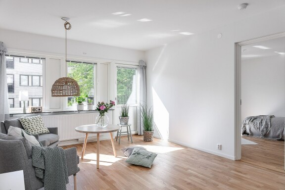 - Genomgående parkettgolv och vitmålade väggar för en modern känsla