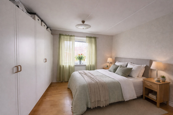 Hela lägenheten kommer att målas om och golven slipas eller bytas ut, vilket skapar en fräsch och modern känsla. I sovrummet kan det bli aktuellt med plastmatta, beroende på slutligt utförande. Köksgolvet är nyligen utfört och kommer inte att bytas nu, ljusgrå färg.