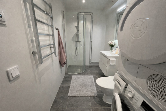 Det rymliga badrummet är helkaklat med vitt kakel och grå klinker. Utrustat med dusch med glasväggar, kommod, vägghängd spegel med LED-belysning, spotlights i taket samt handdukstork och komfortgolvvärme. Här finns även en egen tvättpelare för extra bekvämlighet.