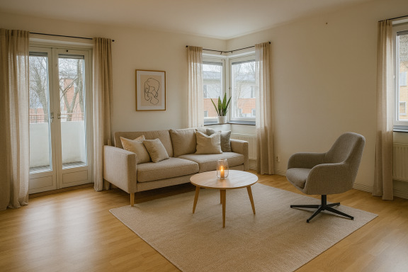 - Ljust vardagsrum med utgång till en balkong i skönt skuggigt läge, perfekt för morgonkaffet eller kvällsro