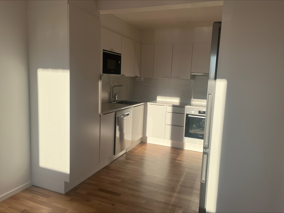 Under 2023 genomgick lägenheten en omfattande renovering där samtliga ytskikt och inredningsdetaljer förnyades. Köket är helt nytt från HTH med vita köksluckor, ljusa bänkskivor i kvartskomposit och ljust kakel som ger ett elegant och tidlöst intryck. Här finns rostfria vitvaror, induktionshäll, varmluftsugn, diskmaskin samt kyl och frys - allt nytt från 2023 och noggrant utvalt för att kombinera design och funktion.