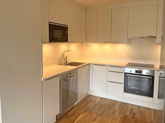 - Nytt HTH-kök med vita köksluckor, bänkskivor i kvartskomposit och ljust kakel
