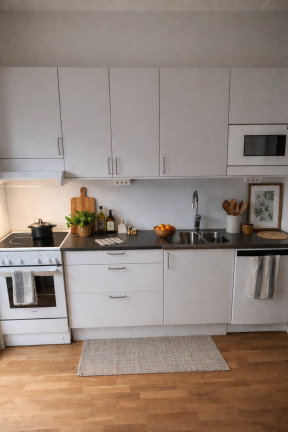 Lägenheterna har ljust och stilrent kök från Marboda. Köket är fullt utrustat med vitvaror som diskmaskin, kyl och frys samt,mikro, ugn med keramikhäll. Lägenhetens badrum är helkaklat, med handdukstork och duschhörna med glasade väggar. Här finns även din egen kombinerade tvättmaskin/torktumlare. Lägenhetsförrådet är placerat i lägenheten.