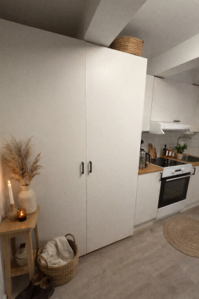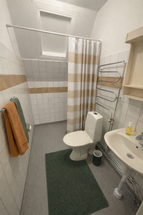 Du välkomnas direkt in i köksdelen som är utrustad med ett praktiskt pentry och plats för ett mindre matbord för två. Lägenheten har ett vardagsrum som vetter mot den rofyllda innergården samt ett sovrum med utsikt mot Regementsgatan. Badrummet är funktionellt med duschstång och halvkaklade väggar. I vardagsrummet ligger ekparkett, medan övriga delar av bostaden har plastmatta. Hyran är 2025 års hyresnivå.