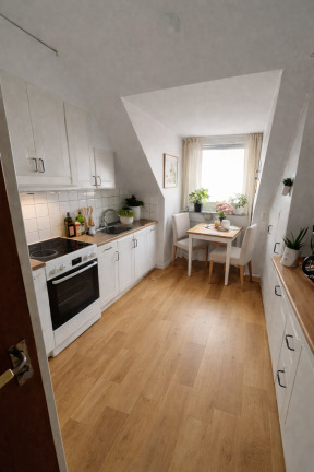 Lägenheten präglas av en trivsam vindskaraktär och ett fint ljusinsläpp. Från vardagsrummet når du en möblerbar balkong i österläge – perfekt för morgonkaffet och lugna stunder i solen. Uppdateringarna med nya parkettgolv bidrar till en fräsch helhet och en enhetlig känsla genom bostaden.