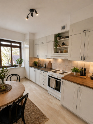 Lägenheten erbjuder en praktisk planlösning med en liten hall som leder vidare till bostadens olika rum. Köket har plats för ett matbord med upp till fyra stolar – perfekt för både vardagsmåltider och mindre middagar. Vardagsrummet är rymligt och pryds av en vacker kakelugn som bidrar med karaktär, även om den inte är eldningsbar. Sovrummet är stort och erbjuder goda förvaringsmöjligheter. Badrummet är utrustad med dusch, där vi kommer att byta ut plastmattan i duschzonen.