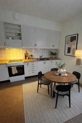 Lägenheten erbjuder ett fint ljusinsläpp och en genomtänkt planlösning. Du möts av en hall med goda förvaringsmöjligheter som leder vidare till ett halvkaklat badrum med fönster och en rymlig dusch. Det stora vardagsrummet är ljust och luftigt, med gott om plats för både soffgrupp och matplats. Sovrummet rymmer enkelt en dubbelsäng och har direkt utgång till en balkong i soligt sydvästläge – perfekt för eftermiddags- och kvällssol. Köket är funktionellt och rymligt med plats för ett större matbord, vilket gör det trevligt för både vardag och umgänge.