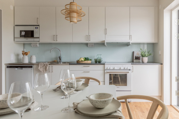 Köket från Marbodal är ljust och stilrent, fullt utrustat för att förenkla vardagen med diskmaskin, kyl och frys, mikro samt ugn med keramikhäll.