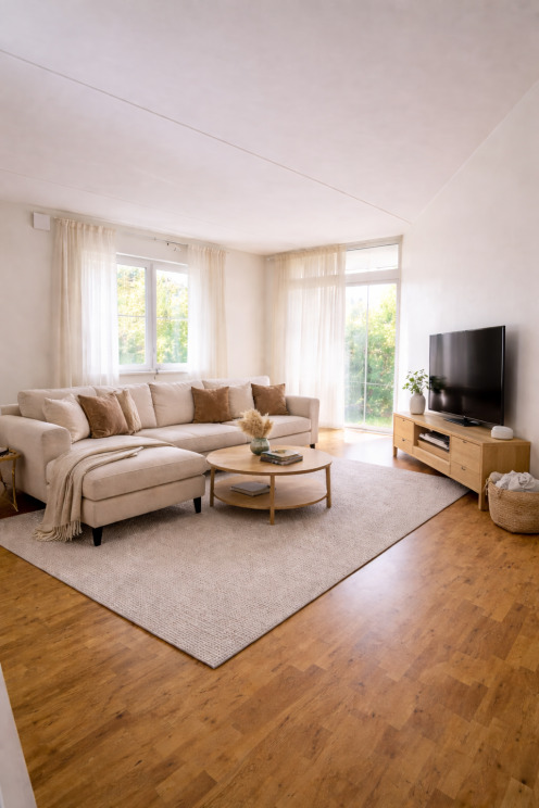 Denna moderna lägenhet erbjuder en inbjudande och social planlösning där kök och vardagsrum samspelar på ett naturligt sätt. Redan i hallen möts du av praktisk klinker som effektivt fångar upp smuts och väta. Vidare in i bostaden ligger vacker ekparkett från Kährs och väggarna är målade i vitt, vilket skapar ett generöst ljusinsläpp och en neutral bas för din personliga inredning.