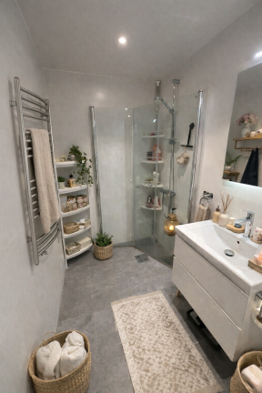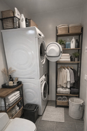 Det helkaklade badrummet är utrustat med dusch med glasdörrar, och tvättmaskin samt torktumlare.