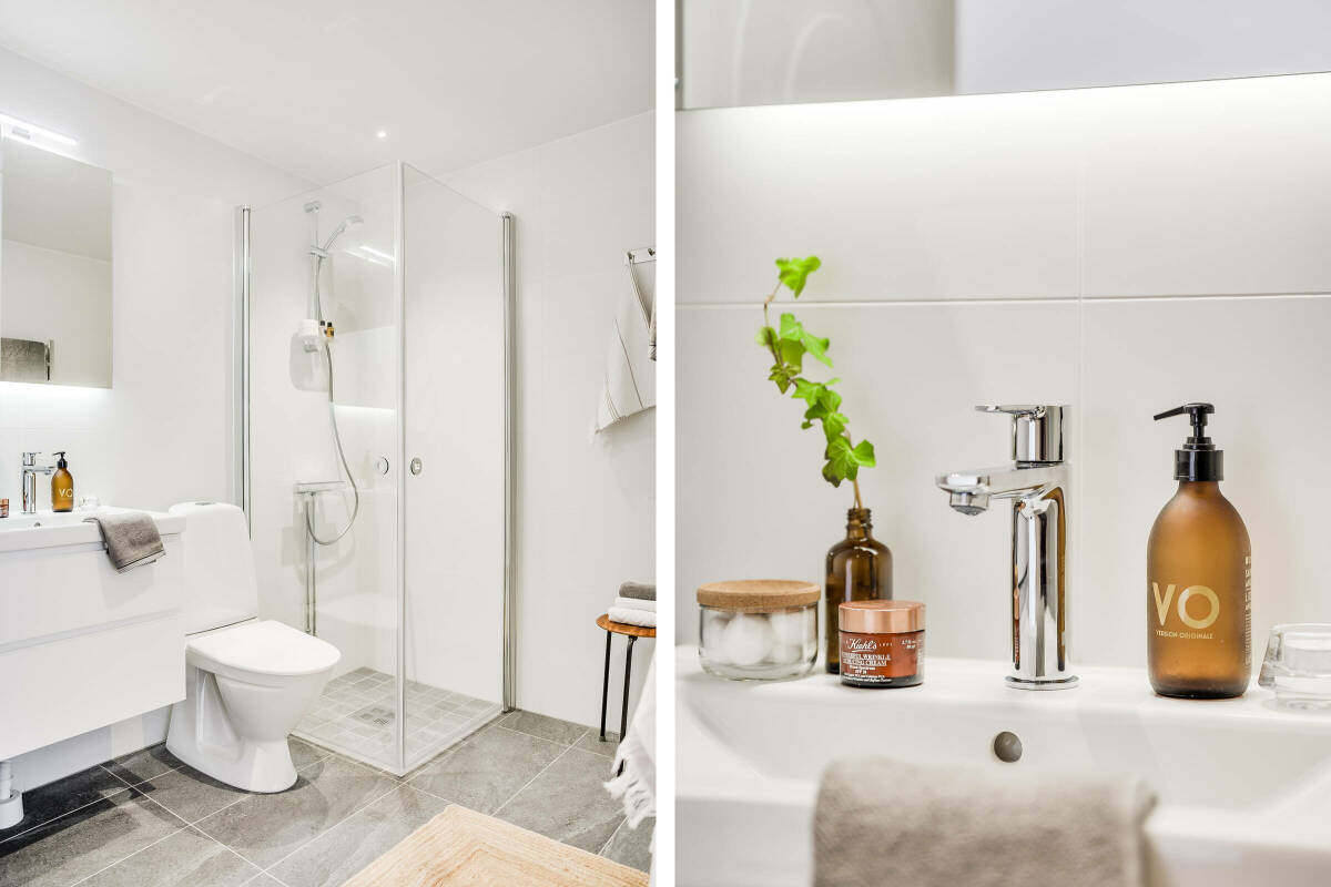 Helkaklat badrum på övre plan med duschdörrar, kommod och handdukstork