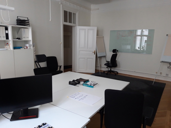 Lokalerna har högt i tak och vackra äldre inredningsdetaljer såsom paneler, takrosetter och fiskbensparkett. Här finns två rejäla rum med stort ljusinsläpp, ytterligare ett par mindre rum samt ett genomgångsrum perfekt för skrivare och som extra förrådsutrymme. I lokalens hjärta hittar vi ett ombonat personalutrymme med pentry samt både ett fräscht badrum med wc och duschkabin samt en separat toalett. Lokalerna erbjuder en personlig "hemma hos-känsla" som skiljer sig från många kontor. Kontoret ligger två trappor upp, hiss finns.