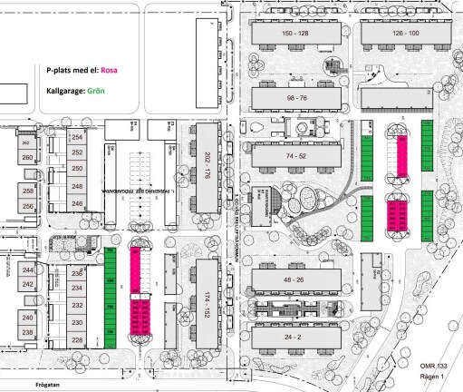 Parkering NR 806 med elstople för motorvärmare på Frögatan, jämna sidan. Förbrukad elström debiteras på egen rad i hyresavin. Moms tillkommer med 25% på hyran om man inte har boendekontrakt hos Heimstaden.